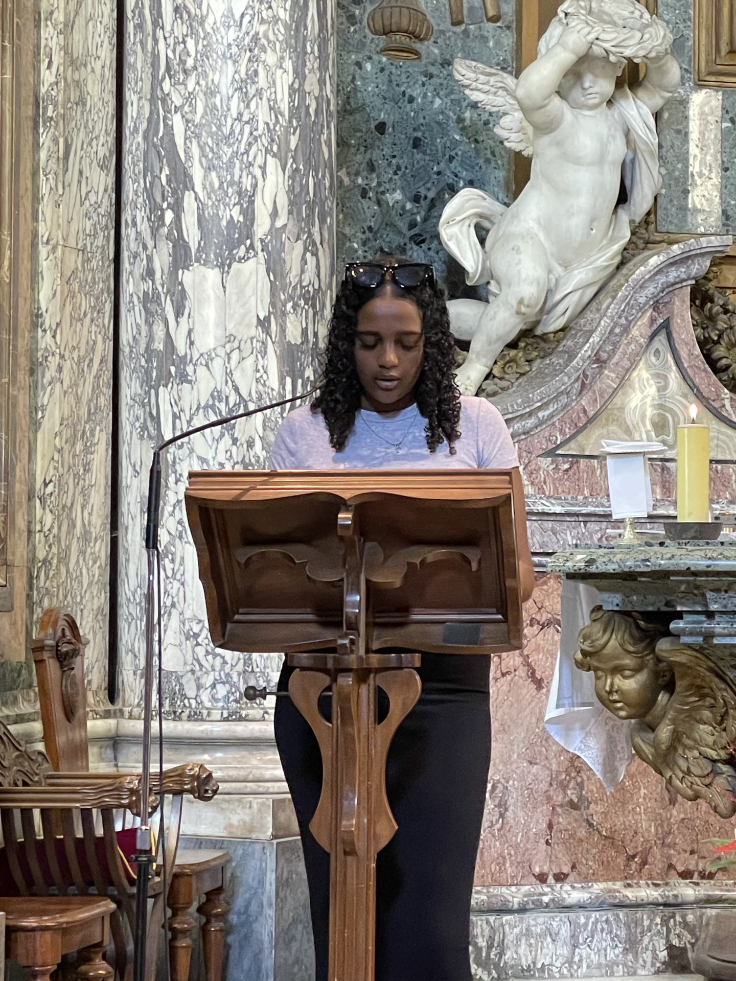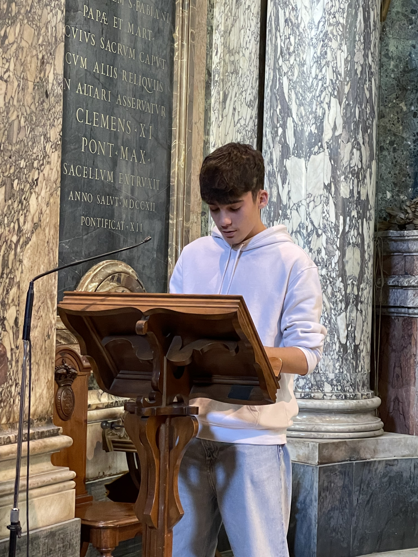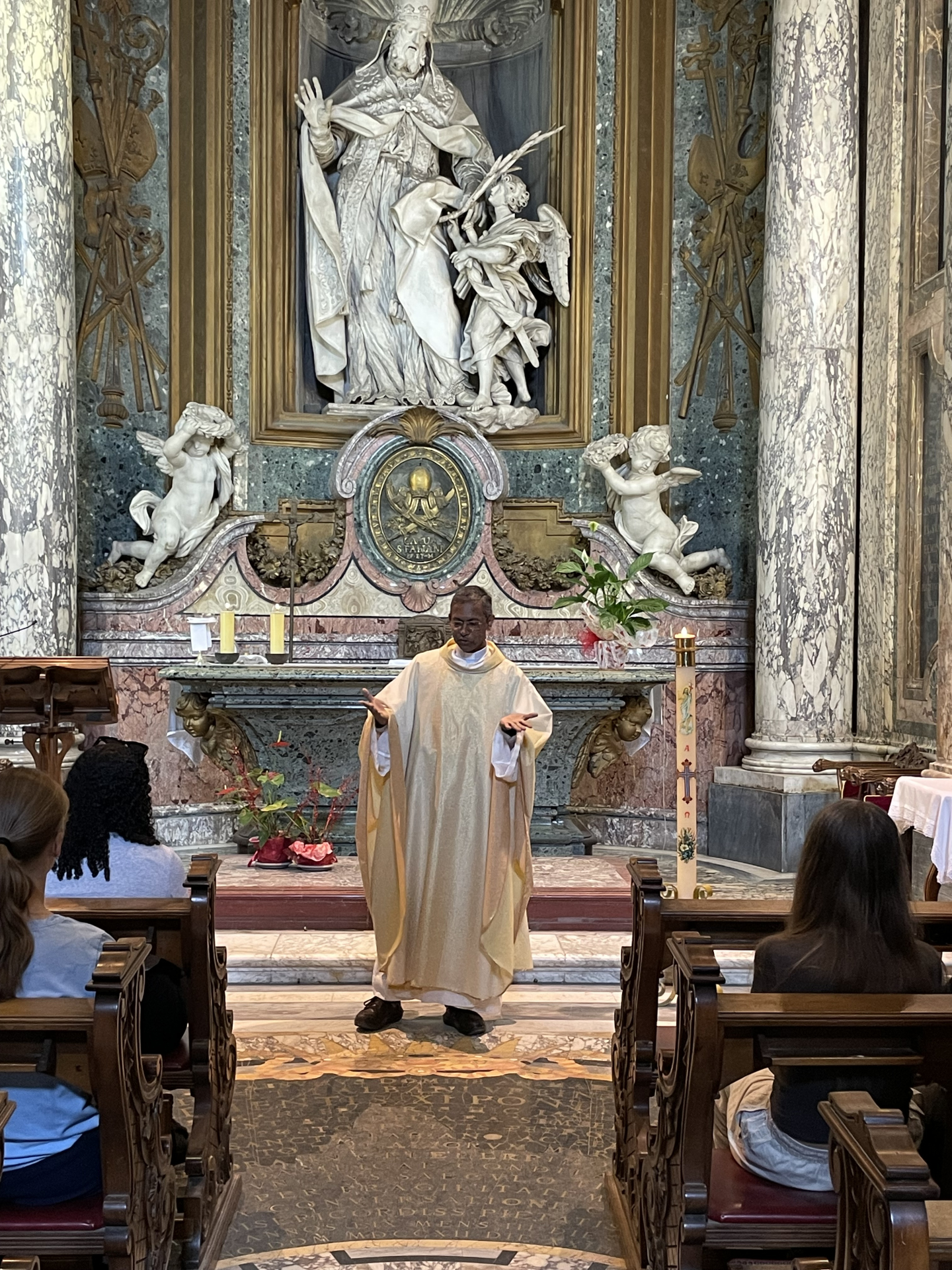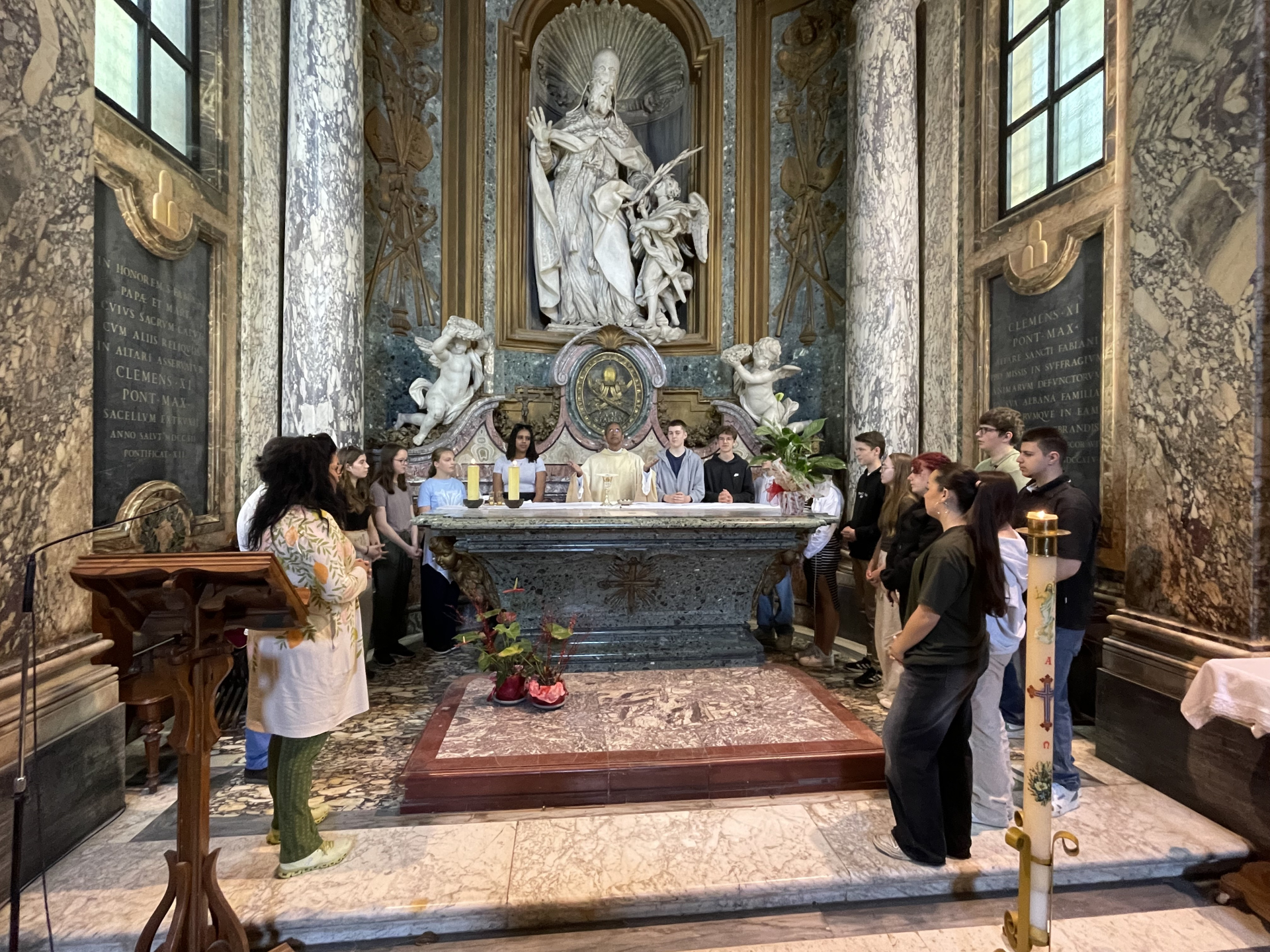 Bei den Katakomben angelangt, feiern wir zuerst mit Pfarrer Francis eine Hl. Messe in der Basilica San Sebstiano. Der Gottesdienst ist sehr familiär. Pfarrer Francis erklärt uns was die Bedeutungen der einzelnen Elemente des Gottesdienstes sind. Gemeinsam beten wir Hand in Hand, singen zusammen und bei der Kommunion dürfen wir das Brot Christi (Hostie) in den Wein tunken. Pater Francis singt für uns ein indisches Kommunionslied.