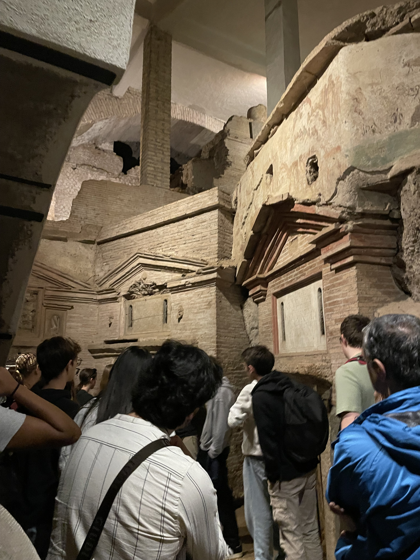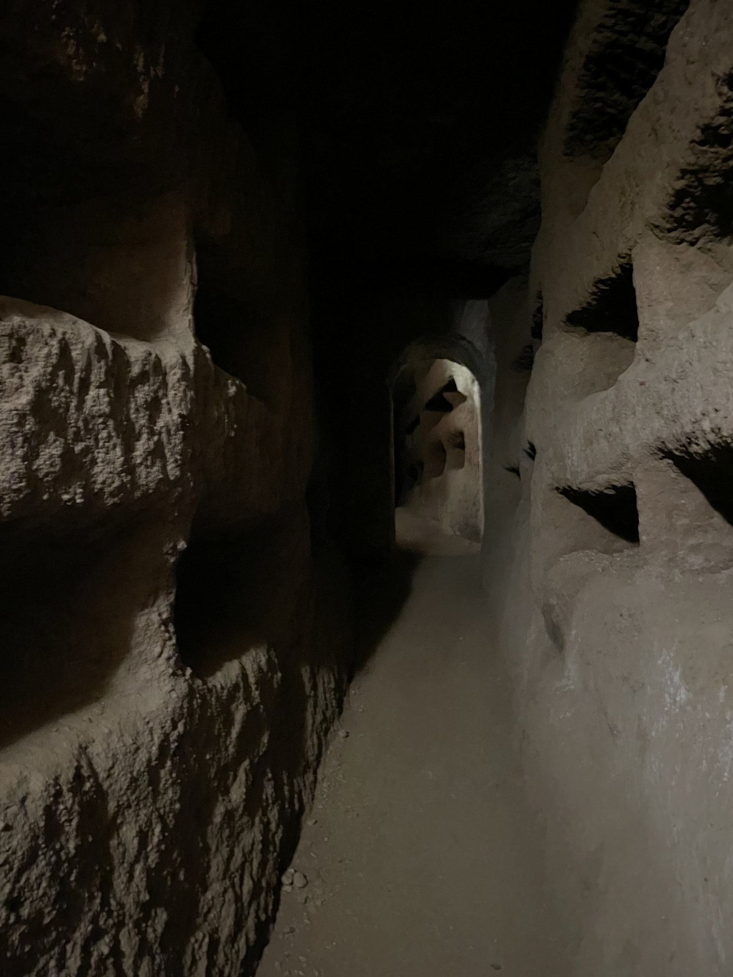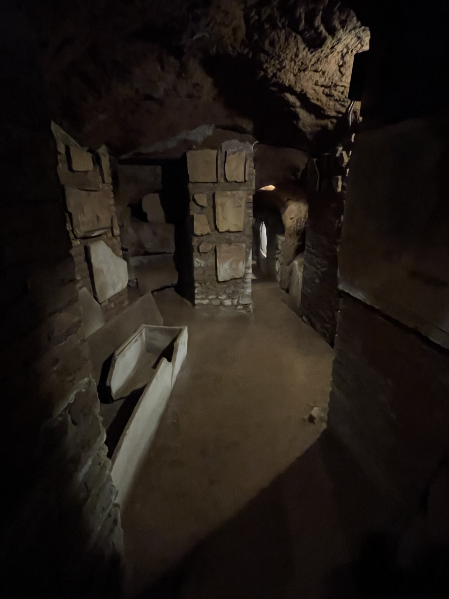 Bestärkt durch diese Messe begeben wir uns zur Führung in die Katakomben. Wir erfahren, dass die Katakomben zu den frühen Zeiten des Christentums genutzt wurden um die Verstorbenen zu begraben und Messen zu feiern. Tief unter dem Boden waren die Christen vor jeglicher Verfolgung sicher. Wir sehen viele Grab-Nischen und Familiengräber in Form kleiner Häuschen.