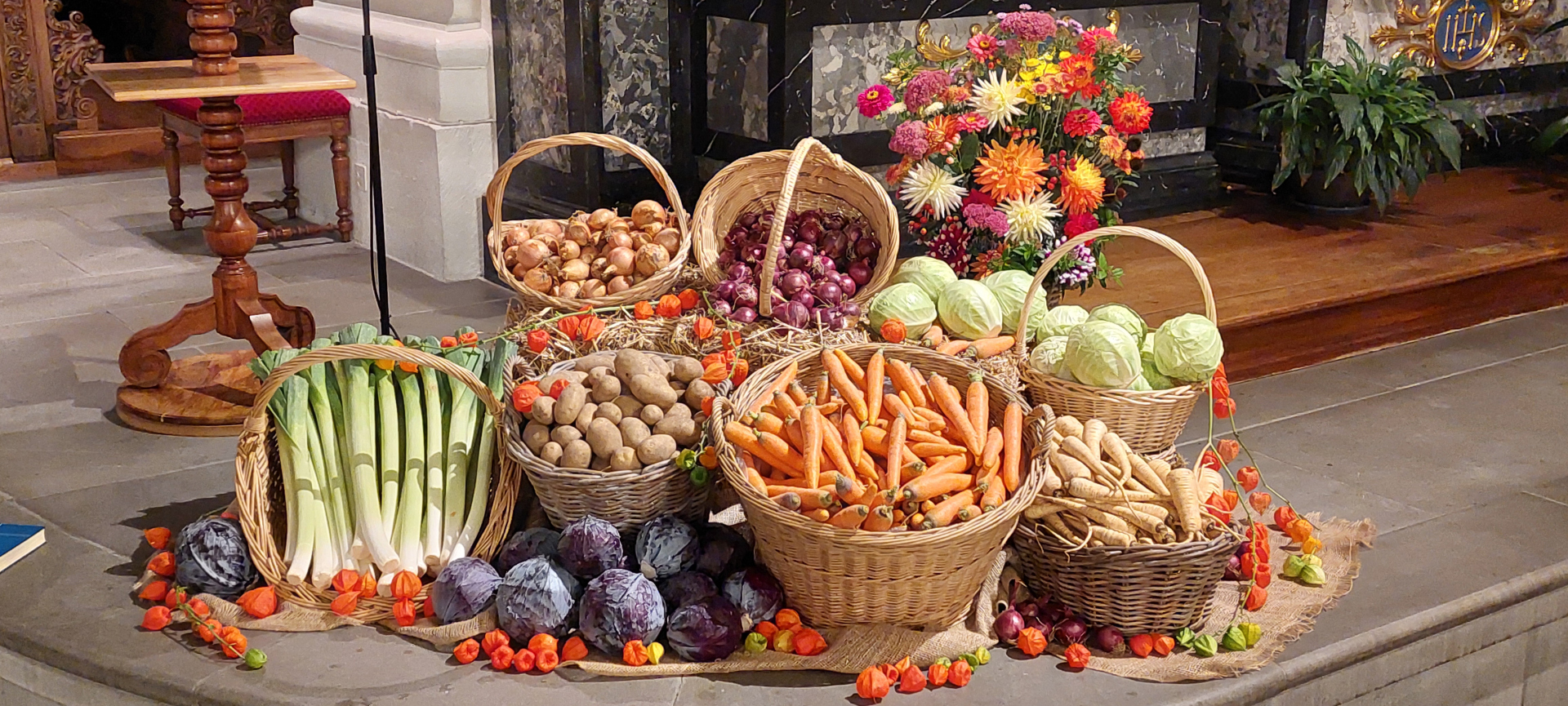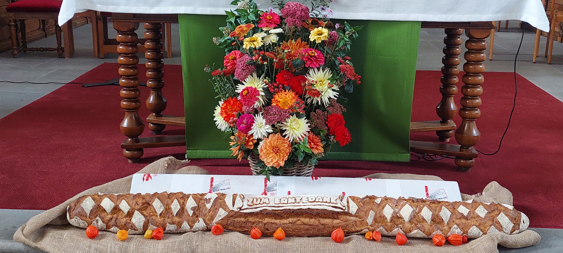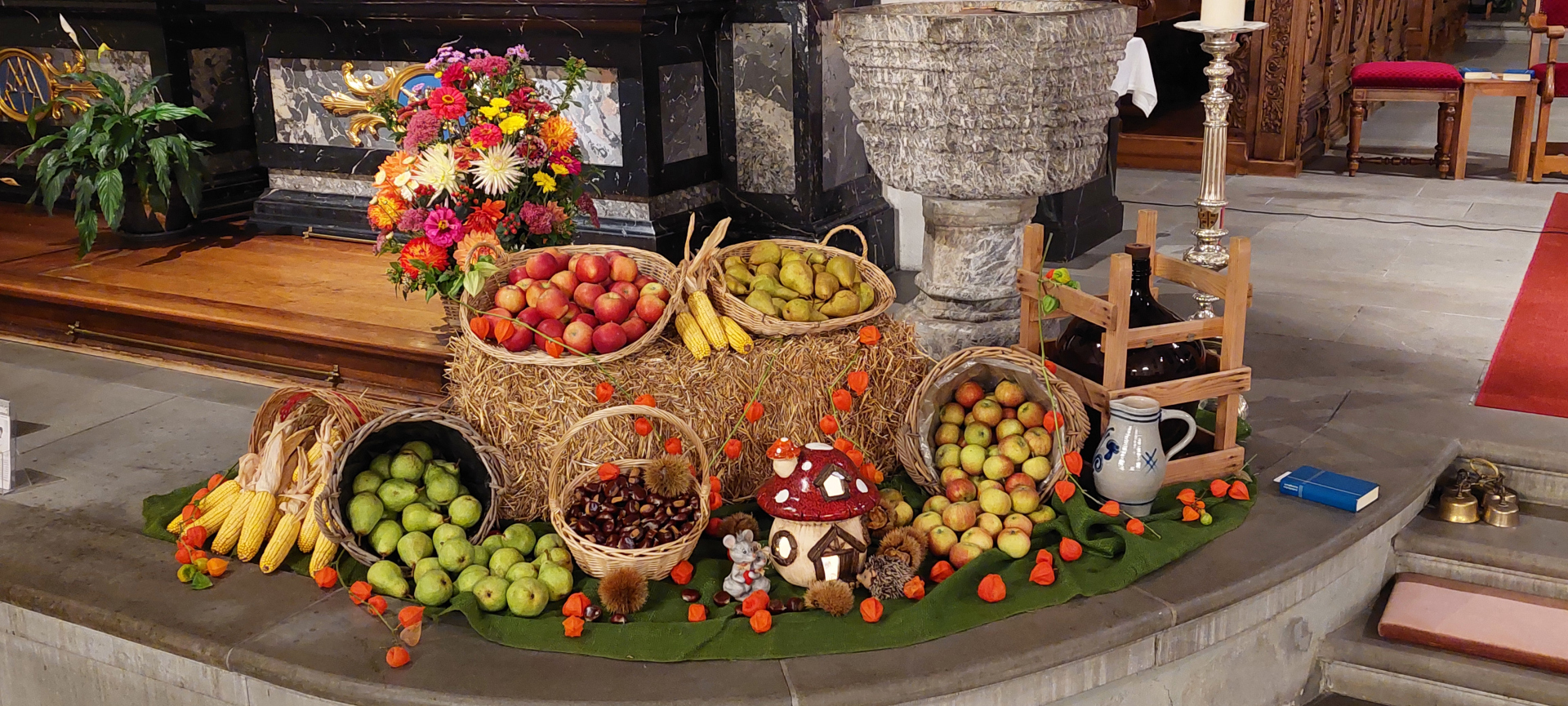 Es wurde am eidgenössischen Dank-, Buss- und Bettag Erntedank gefeiert. Zu diesem Anlass hat Sakristan Kari Ziltener die Kirche mit Obst- und Gemüse-Körben geschmückt und liebevoll mit Blumen verziert. Dieses Jahr fand man auch ein beleuchtetes Pilzhäuschen inmitten der guten Gaben. Wohnt dort wohl die Kirchenmaus Amalie, welche die Kinder an der Familienfeier eine Woche zuvor kennenlernen durften?