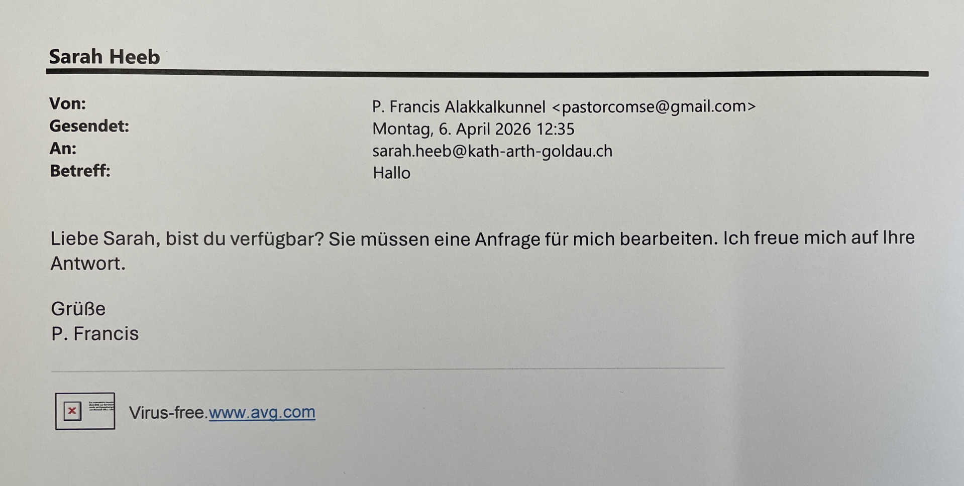 Wenn Sie ein Mail von Pfarrer Francis erhalten, achten Sie unbedingt auf die Absender-Adresse hinter dem angegebenen Namen. Sollte sie anders lauten als pfarrer.arth@kath-arth-goldau.ch wird es mit grösster Wahrscheinlichkeit eine Fake-Mail sein. In diesem Fall ausschliesslich Mail löschen. Bei Unsicherheiten empfiehlt sich eine Rücksprache via Telefon bei Pfarrer Francis. Besten Dank für die Kenntnisnahme.