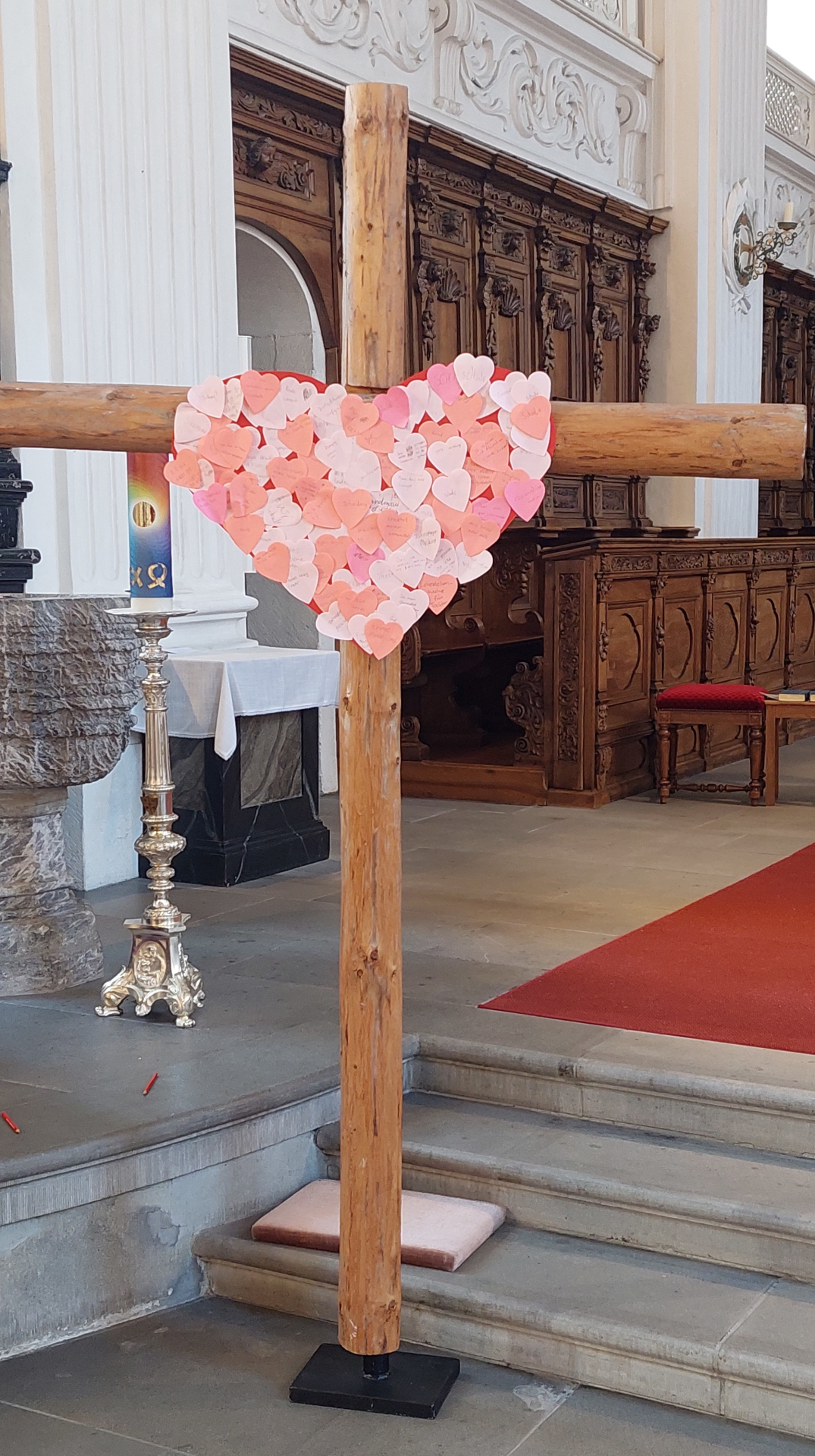 Haben Sie etwas auf dem Herzen? Etwas dass Sie belastet... dann vertrauen Sie es Gott an und schreiben Sie es auf ein Herz und kleben es ans Kreuz (das Material dazu liegt in der Kirche).