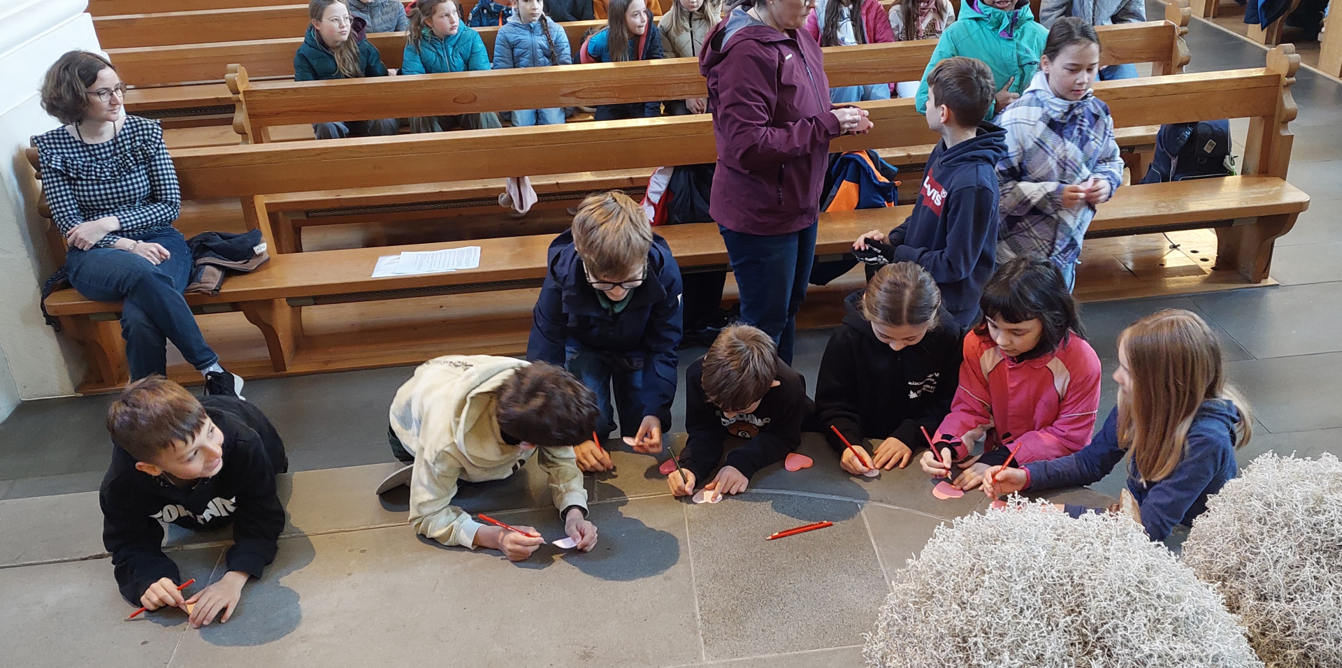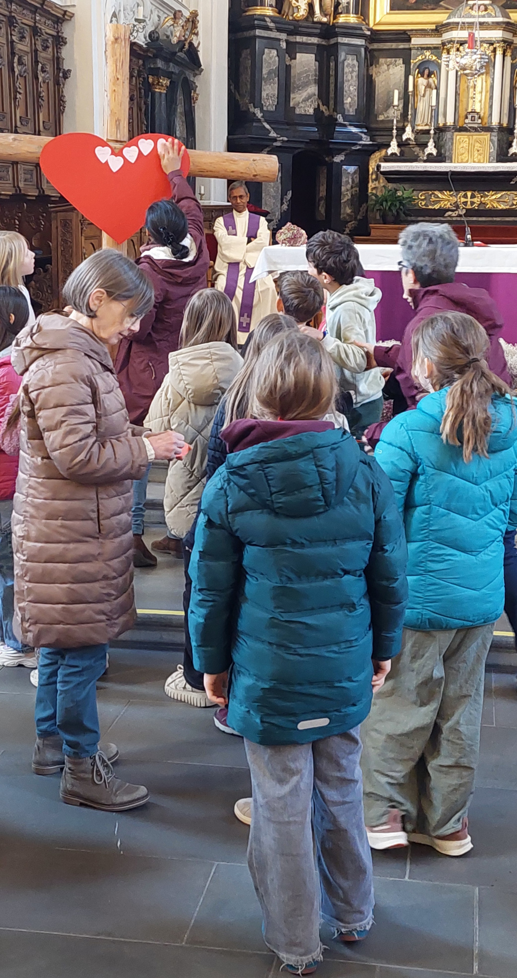 Auch in unserem Leben gibt es manchmal schweres und belastendes. Dieses wurde von den Kindern auf einen Herzzettel aufgeschrieben und auf das grosse Herz am Kreuz geklebt. Es war ein Schulgottesdienst, der zum Nachdenken anregte.