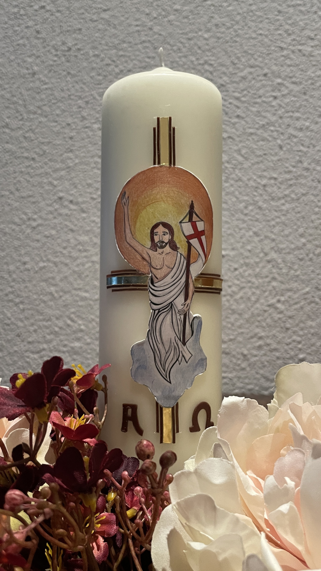 Die diesjährige Osterkerze wird von einem, von Sandra Suter (Nichte von Sakristan Kari Ziltener), selbst gemalten Bild von Jesus geziert. Ab sofort kann die Heim-Osterkerze für Fr. 10.- in der Pfarrkirche Arth gekauft werden.