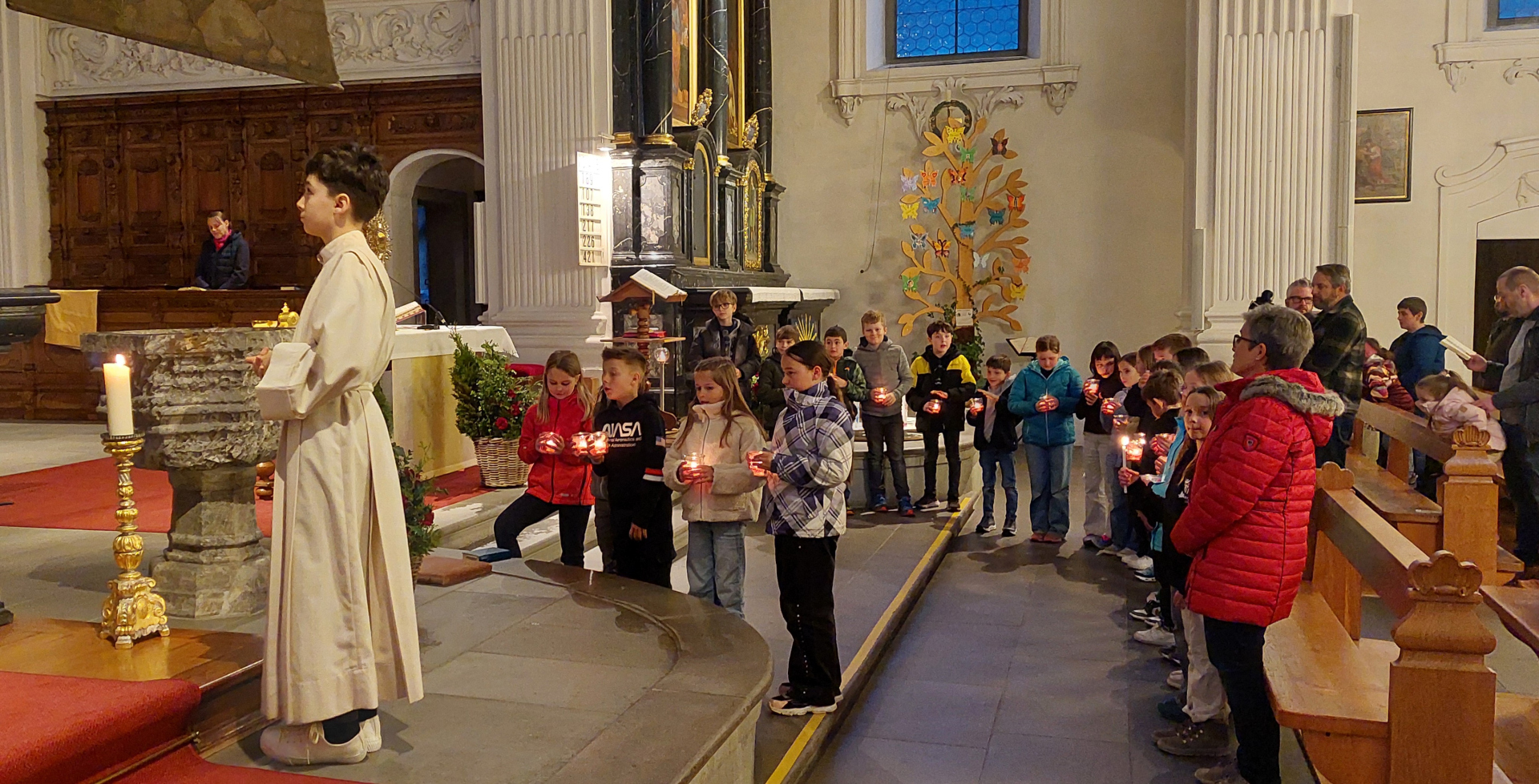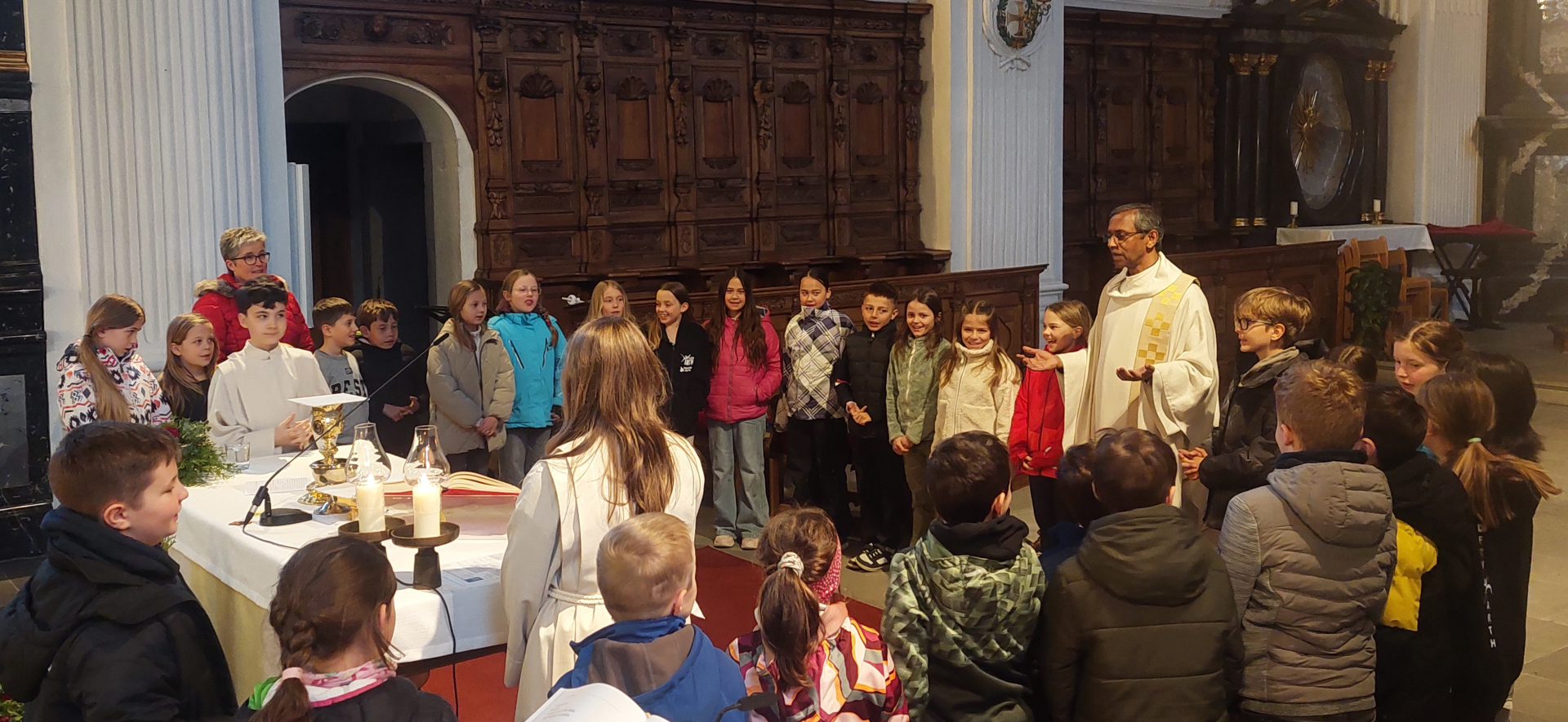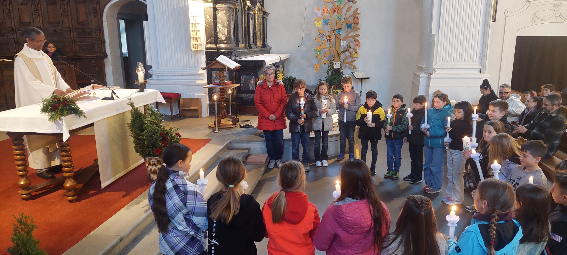 Zur Vorbereitung auf die Erstkommunion gehört die Erneuerung des Taufversprechens dazu. Diese wurde am Hohen Donnerstag im Rahmen des Abendmahlgottesdienstes gefeiert. Zu diesem Anlass wurden die Taufkerzen der Kinder entzündet. Auf die Fragen zu ihrem Glauben von Pfarrer Francis antworteten die Kinder mit "Ich widersage" und "ich glaube". Anschliessend begleiteten die Kinder mit Kerzen das Allerheiligste zum Seitenaltar. So gehen die Kinder gestärkt auf ihren grossen Tag den Weissen Sonntag, 12. April, zu.